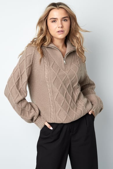 Gestrickte Wollmischung Damen Viertel-Reißverschluss-Pullover Diamant-Kabelstrick
